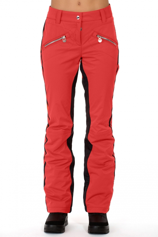 Модель застегивается на молнию и крючок. В поясе мягкая флисовая вставка. На бедрах карманы на молнии в контрастной рамке. Вдоль бокового шва идет широкая контрастная вставка.